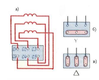 Обмотка статора состоит из трёх отдельных частей, называемых фазами. Начала фаз обозначаются буквами c 1, c 2, c 3, концы – c 4, c 5, c 6.