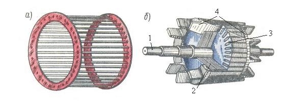 Короткозамкнутая обмотка (рис. 2.3) ротора состоит из стержней 3, которые закладываются в пазы сердечника ротора. С торцов эти стержни замыкаются торцевыми кольцами 4. Такая обмотка напоминает “беличье колесо” и называют её типа “беличьей клетки” (рис. 2.3.а). Двигатель с короткозамкнутым ротором не имеет подвижных контактов. За счёт этого такие двигатели обладают высокой надёжностью. Обмотка ротора выполняется из меди, алюминия, латуни и других материалов.