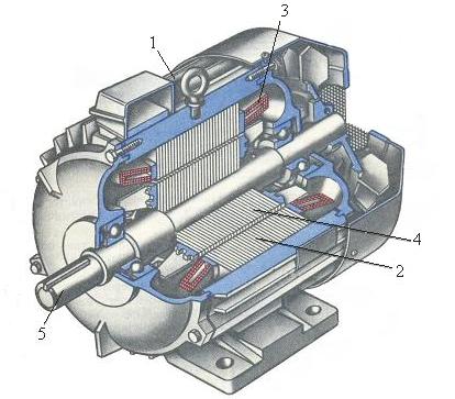 На рис. 2.6 приведен вид асинхронной машины с короткозамкнутым ротором в разрезе: 1 – станина, 2 – сердечник статора, 3 – обмотка статора, 4 – сердечник ротора с короткозамкнутой обмоткой, 5 – вал.