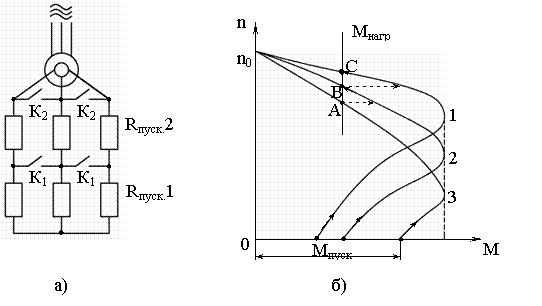 На рис. 2.10 приведена схема реостатного пуска (рис. 2.10.а) и механические характеристики (рис 2.10.б) при этом пуске.