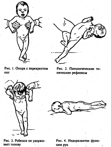 Двигательное развитие. Положение тела ребенка вынужденное. Резко повышен общий мышечный тонус. Голову не держит, не поворачивается, кисти рук плотно сжаты в кулаки, отсутствуют попытки тянуться к игрушкам, вложенную игрушку не удерживает. Опора на ноги с грубым перекрестом ног на уровне бедер. Часты судорожные вздрагивания.