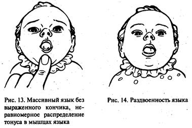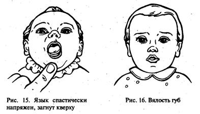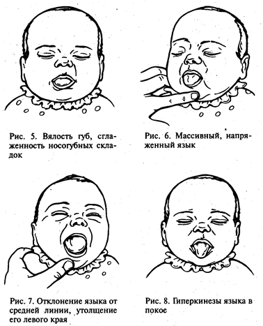 Характеристика артикуляционного аппарата, голоса и дыхания. У детей с церебральным параличом изменения мышечного тонуса губ (рис. 5), языка (рис. 6, 7) проявляются в паретичности, спастичности, дистонии или гиперкинезах (рис. 8). Нарушение подвижности губ и языка затрудняет процессы сосания и глотания. Нередко отмечается подтекание молока из углов губ и носа. Лицо амимичное. Иногда нарушается дыхание: оно поверхностно, аритмично, асинхронно с сосанием.