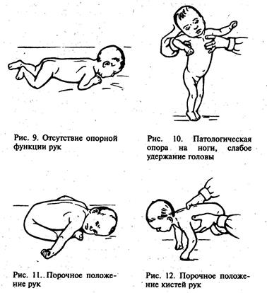 Характеристика двигательного развития. Произвольная моторика крайне ограничена (рис. 9, 10). Дети слабо удерживают голову (рис. 10), кисти рук в порочных положениях (рис. 11, 12). У них начинает развиваться зрительно-моторная координация, они тянутся к игрушкам, но захват удается после многократных попыток. Манипулятивная деятельность отсутствует. При попытках посадить их дети не удерживают вертикального положения