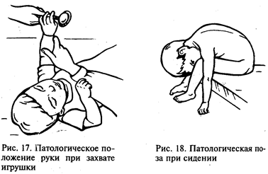 Характеристика двигательного развития. У детей, находящихся на этом уровне, развивается зрительно-моторная координация. Они могут захватить игрушку, совершить с ней примитивные манипуляции, но их движения ограничены, напряженны, крайне неловки (рис. 17), игрушки часто выпадают из рук. Дети в состоянии удержаться в вертикальном положении в специальном стуле, но самостоятельно не сидят (рис 18) и не стоят (рис. 19, 20).