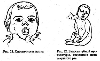 Характеристика артикуляционного аппарата, голоса, дыхания. Становится очень заметной псевдобульбарная симптоматика, проявляющаяся в нарушениях голоса, дыхания, процесса кормления. Четко проявляются такие патологические симптомы артикуляционного аппарата, как спастичность (рис. 21), паретичность (рис. 22), дистония, гиперкинезы языка, оральные синкенезии. Подвижность языка, губ значительно ограничена. Для иллюстрации третьего уровня доречевого развития детей с церебральным параличом приводим пример № 3.