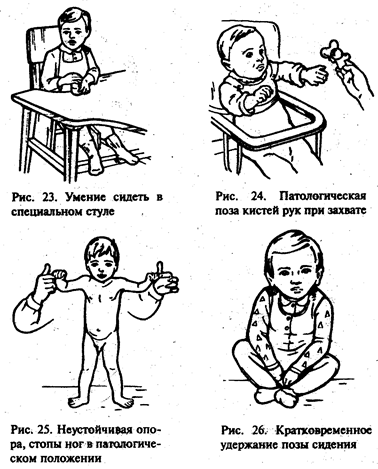 Характеристика двигательного развития. Дети могут сидеть в специальном стуле (рис. 23), держать голову, брать игрушки и манипулировать ими, но при этом часто отмечается атаксия, гиперкинезы в руках, дизметрии, порочные положения кистей рук и пальцев (рис. 24). При помощи взрослых дети могут стоять и переступать у опоры, но положение ног при этом порочное (рис. 25). При поддержке за обе руки дети переступают, но часто с