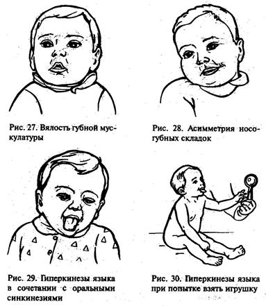 Артикуляционный аппарат, голос, дыхание. Лицо маскообразное, с открытым ртом. Язык напряжен, в виде жала высовывается изо рта. При оптических и слуховых раздражениях возникают гиперкинезы языка и оральные синкинезии. Спонтанных и произвольных движений языка нет. Позу закрытого рта не удерживает. Голос дисфоничный, сдавленный, тихий, лишенный выразительности. Дыхание аритмичное, стридорозное. Кормление замедленное с поперхиваниями. Пищу во рту не удерживает, поэтому кормится в лежачем положении.