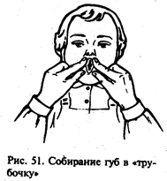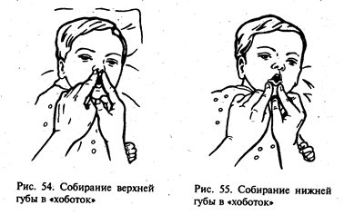 1) поместив указательные пальцы обеих рук в углы губ, собирают верхнюю губу, производя движения к средней линии, тем же приемом собирают нижнюю губу (рис. 54, 55);