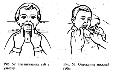 2) растягивают губы в улыбку, поставив указательные пальцы обеих рук в углы губ (рис. 52);