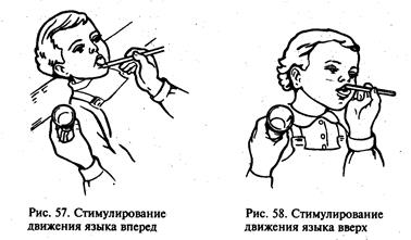 1) при раздражении середины губы сиропом шиповника стимулируют выдвижение языка вперед (рис. 57), вверх, слизывание (рис. 58, 59);