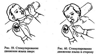 2) при раздражении углов губ стимулируют боковые движения языка (рис. 60).