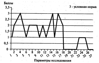 Нами разработана и апробируется в условиях поликлиники система логического обследования детей третьего года жизни. Используется балльная система оценки 27 параметров, включающих внеречевую и речевую деятельность ребенка. Рекомендуемая схема может быть предложена в качестве протокола в ходе ведения обследования. Обобщенные результаты позволяют составить график-профиль психоречевого развития ребенка трех лет. Визуальная картина структуры дефекта дает возможность спланировать комплексную программу медико-психологической и коррекционной логопедической помощи ребенку. Положительная динамика может выражаться более высоким баллом в этой схеме-протоколе в графе «После» и переноситься в график, что свидетельствует об эффективности коррекционных мероприятий.