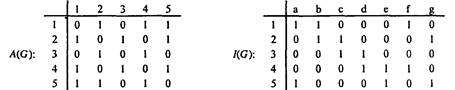 Матрица инцидентности. Если вершины графа G помечены метками v1, v2,..., vm, а ребра - метками е1, е2,..., еп, то элементы матрицы инцидентности I(G) размера М х N определяются правилом: B(ij) = 1, если vi инцидентна ej; B(iJ) = 0 в противном случае (см. рис. 1.9, б).