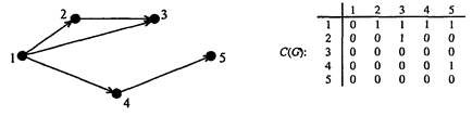 Для ориентированного графа G, имеющего N вершин можно рассмотреть матрицу достижимости C(G) размера N х N, элементы которой определяются так: С(I, J) = 1, если вершина vj достижима из vi; C(I, J) = 0 в противном случае. Ниже приведен пример ориентированного графа и его матрицы достижимости, рис. 1.10.