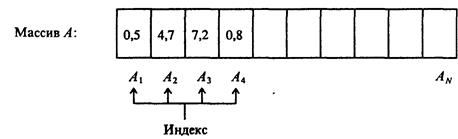 Массивом называют однородный набор величин одного и того же типа, называемых компонентами массива, объединенных одним общим именем (идентификатором) и идентифицируемых (адресуемых) вычисляемым индексом. Это определение подчеркивает, что все однотипные компоненты массива имеют одно и то же имя, но различаются по индексам, которые могут иметь характер целых чисел из некоторого диапазона, литер, перечисленных констант. Индексы позволяют адресовать компоненты массива, т.е. получить доступ в произвольный момент времени к любой из них как к одиночной переменной (рис. 1.32). Обычный прием работы с массивом - выборочное изменение отдельных его компоневт.