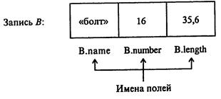 Запись В состоит из трех полей, имеющих последовательно типы «текст», «целое число», «вещественное число»: 1-е поле - название детали, 2-е - условный номер по каталогу, 3-е - длина. При работе с одной единственной записью (что бывает нечасто), имя поля можно использовать как обычную переменную, т.е. можно изменять значение поля с помощью операции присваивания или любых других операций, доступных над величинами данного типа. Если же данная запись - лишь часть набора данных, то имя поля состоит из двух частей и называется составным именем поля (на рис. 1.33 составные имена В. name, В. number, В. length).