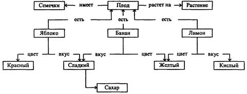 Семантическая сеть - иной подход к представлению знаний, который основан на изображении понятий (сущностей) с помощью точек (узлов) и отношений между ними с помощью дуг на плоскости. Семантические сети способны отображать структуру знаний во всей сложности их взаимосвязей, увязать в единое целое объекты и их свойства. В качестве примера может быть приведена часть семантической сети, относящейся к понятию «фрукты» (рис. 1.47).