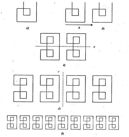 Процесс получения бордюра с помощью заданных образующих вторым из описанных выше способом проиллюстрирован поэтапно. На элементарный мотив действуем параллельным переносом на вектор b, см. схему б. Получим фигуру, состоящуюиз элементарного мотива и его образа. На новую фигуру действуем осевой симметрией с осью а. Получим фигуру, изображенную на схеме в, на которую действуем параллельным переносом 2b. В результате получим новую фигуру, см. схему г. Продолжая этот процесс, получаем фрагмент бордюра нужной длины.