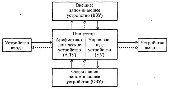 Рис. 4.10. Архитектура ЭВМ, построенной на принципах фон Неймана. Сплошные линии со стрелками указывают направление потоков информации, пунктирные-управляющих сигналов от процессора к остальными узлам ЭВМ
