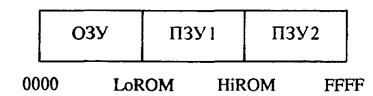 Рис. 4.17. Структура памяти микрокомпьютера «Е97» (LoROM - нижняя граница ПЗУ 1. HiROM-верхняя граница ПЗУ 1, совпадающая с началом ПЗУ 2)