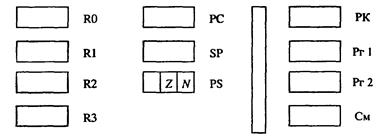 Такова внутренняя структура учебного микрокомпьютера. Рассмотрим теперь устройство самого процессора, каким он видится программисту. «Е97» состоит из семи 16-разрядных регистров. 4 регистра общего назначения RO - R3, счетчика адреса команд PC (Program Counter), указателя стека SP (Stack Pointer) и регистра состояния процессора PS (Processor Status), в котором мы будем использовать только два младших бита N и Z. «Поведение» этих управляющих битов согласно общепринятым закономерностям следующее: