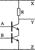 Допустим, на входах А и В нет напряжения («нет» и «нет»). В последней колонке табл. 4.6 этому соответствует А = 0, В = 0. Тогда оба транзистора «заперты», ток по цепи не протекает и между точками Y и Z есть разность потенциалов - т.е. результат операции «да», что в логических обозначениях соответствует 1 (именнокак втабл. 4.6). Если заперт один из транзисторов, то результат все равно такой же (сравните с табл. 4.6). Лишь если оба транзистора открыты, ток в цепи идет и между точками Y и Z разности потенциалов нет (падение напряжения на самих транзисторах ничтожно мало по сравнению с его падением на резисторе).