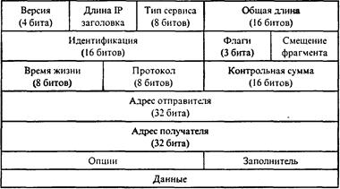 В настоящее время используется четвертая версия протокола, следовательно, поле версия принимает значение «4». Сам заголовок, включая необязательные опции и символы заполнения, имеет длину, равную значению поля длина IP-заголовка. Длина исчисляется в 32-битовых словах. Поле тип сервиса определяет способ обслуживания пакета в конкретных сетях и, главным образом, связано с возможностью задержки ( delay ) пакета в сети. Поле общая длина определяет длину IP-пакета без заголовка. Длина измеряется в октетах (байтах). Поле идентификация предназначено для помощи при «сборке» сообщения. Поле флаги определяет место датаграммы в сообщении (первая, последняя и т.п.). Поле смещение фрагмента определяет смещение датаграммы относительно начала сообщения. Поле время жизни предназначено для определения срока, после которого пакет должен быть удален из сети. Поле протокол определяет тип датаграммы. Поле контрольная сумма служит для идентификации повреждений пакета при передаче. Контрольная сумма вычисляется только по заголовку пакета. Поле адрес получателя - IP-адрес места назначения. Поле адрес отправителя - IP-адрес отправителя. Опции могут иметь переменную длину и обычно применяются для трассировки пакетов, обеспечения безопасности. Заполнитель применяется для выравнивания заголовка на 32-битовую границу.