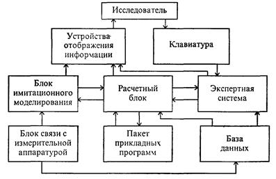 Блок связи с измерительной аппаратурой преобразует к нужному виду информацию, поступающую от измерительной аппаратуры. В базе данных хранится информация, поступившая из блока связи с измерительной аппаратурой, а также заранее введенная с целью обеспечения работоспособности системы. Расчетный блок, выполняя программы из пакета прикладных программ, производит все математические расчеты, в которых может возникнуть потребность в ходе научных исследований Расчеты могут выполняться по требованию самого исследователя, или блока имитационного моделирования. При этом на основе математических моделей воспроизводится процесс, происходящий во внешней среде.