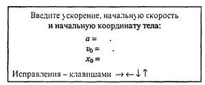 Спроектируем возможное оформление диалога и формы представления результатов для одной из рассмотренных ниже задач по моделированию. Уместно начать с кадра-заставки, где написаны название задачи, фамилия автора программы - это минимум. Если удастся создать несложный рисунок, иллюстрирующий задачу - очень хорошо, он уместен в том же кадре. Затем, через несколько секунд, кадр сменяется следующим. На нем - основное уравнение (т.е. сама математическая модель) и предложение ввести исходные данные - с представлением шаблонов, или, если это затруднительно, то в свободной форме, но обязательно со словесным запросом значения каждого параметра по очереди. Более чем существенно разумно спроектировать формы для вывода результатов - таблицы, графики, траектории и т.д., их очередность, взаимное расположение.