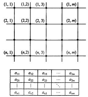 Опишем типичную процедуру построения изолиний на экране компьютера. На старте мы имеем двумерную таблицу значений некоторой величины А, полученную в ходе математического моделирования; числа в этой таблице соответствуют значениям этой величины в узлах пространственной сетки (рис. 7.5).