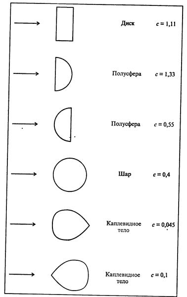 На самом деле первые два результата совершенно не соответствуют действительности. Дело в том, что уже при гораздо меньших скоростях сила сопротивления становится пропорциональной квадрату скорости: Fcoпp = k2v2. Разумеется, линейная по скорости часть силы сопротивления формально также сохранится, но если k2v2 >> k1v, то вкладом k1v можно пренебречь (это конкретный пример ранжирования факторов). О величине k2 известно следующее: она пропорциональна площади сечения тела S, поперечного по отношению к потоку, и плотности среды ρ среды и зависит от формы тела. Обычно представляют k2 = 0,5 сSρ срeды, где с - коэффициент лобового сопротивления - безразмерен. Некоторые значения с (для не очень больших скоростей) приведены на рис. 7.6.