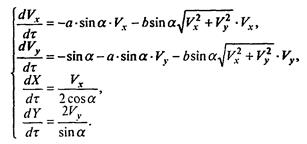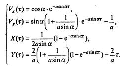 Важнейшая роль обезразмеривания - установление законов подобия. У изучаемого движения есть множество вариантов, определяемых наборами значений параметров, входящих в уравнения (7.12), (7.13) или являющихся для них начальными условиями: k1, k2, m, g, v0, а. После обезразмеривания переменных появляются безразмерные комбинации параметров - в данном случае a, b, α - фактически определяющие характер движения. Если мы изучаем два разных движения с разными размерными параметрами, но такие, что а, b и α одинаковы, то движения будут качественно одинаковы. Число таких комбинаций обычно меньше числа размерных параметров (в данном случае вдвое), что также создает удобство при полном численном исследовании всевозможных ситуаций, связанных с этим процессом. Наконец, как уже отмечалось, величины Vx, Vy, X, Y, τ физически легче интерпретировать, чем их размерные аналоги, так как они измеряются относительно величин, смысл которых очевиден. Прежде чем предпринимать численное моделирование, отметим, что при учете лишь линейной составляющей силы сопротивления модель допускает аналитическое решение. Система уравнений (7.14) при b = 0достаточноэлементарно интегрируется и результаты таковы: