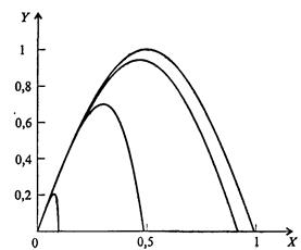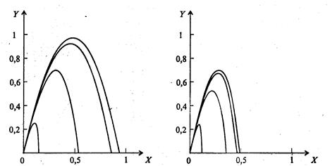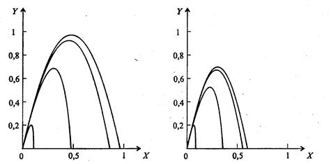 Рис. 7.11. Влияние параметра а на движение тела, брошенного под углом к горизонту, при b = 0,1 (слева) и при b = 1 (справа); α = π /4 (а = 0,01; 0,1; 1; 10; кривые на рисунках соответственно располагаются справа налево)