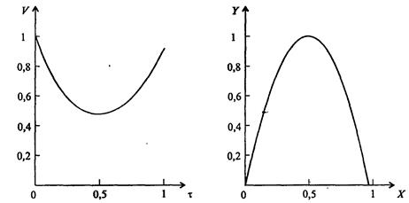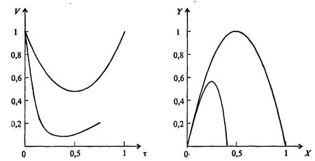 Рис. 7.10. Графики зависимости V(τ) и Y(X) при решении задачи о полете тела, брошенного под углом к горизонту, без учета сопротивления воздуха (скорость изменяется от 1 и вновь достигает значения 1; траектория - парабола) и с учетом сопротивления воздуха (конечная скорость меньше 1, и траектория - далеко не парабола) (а = 1, b = 1)