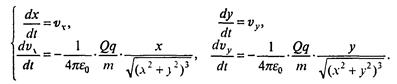 2) движение заряженного тела в поле, созданном несколькими фиксированными зарядами произвольных знаков (рекомендуем начать со случая, когда все фиксированные заряды лежат в одной плоскости и начальное положение и скорость движущегося заряда - в той же плоскости);