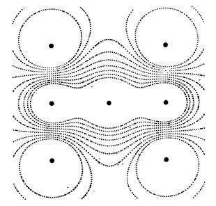Даже если все заряды лежат в одной плоскости (как это было на рис. 7.26 и 7.27), поле существует, конечно, и вне этой плоскости. Один из способов наглядного построения изображения поля - найти изолинии, соответствующие некоторому фиксированному набору значений Ф; в нескольких параллельных плоскостях и представить их на общем рисунке, дающем представление о поверхностях равного потенциала. Для этого программу, приведенную выше, следует слегка дополнить.