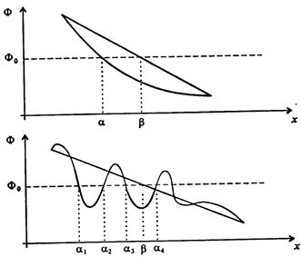 Рис. 7.28 На верхнем рисунке α - точка, в которой Ф = Ф0. β ≈ α - найдено линейной интерполяцией. На нижнем рисунке точек, в которых Ф = Ф0, много; β формально найдено линейной интерполяцией