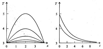 Рис. 7.36. Графики зависимости температуры от координаты в разные моменты времени (сверху вниз t = 0, t = 2, t = 4, t = 6, t = 8), в начальный момент времени температура самая высокая, затем она постепенно выравнивается, и зависимости температуры от времени в разных точках стержня. Верхняя кривая соответствует x = 2; ниже - x = 1 и х = 3; прямая линия, совпадающая здесь с осью абсцисс, - значение температуры на концах стержня