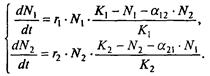 в этом случае называют коэффициентом конкуренции. Обозначим ее α12. Таким образом, чтобы отразить суммарное воздействие на вид 1, надо в логистическом уравнении в числителе дроби вместо N записать N1 + α12∙N2. Аналогично получается уравнение для исследовании численности второй популяции. В результате получаем систему двух дифференциальных уравнений: