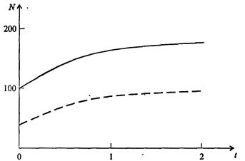 Рис. 7.43. Устойчивое сосуществование популяций при r1 = 2, r2 = 4, К1 = 200, К2 = 180, α12 = 0,5, α21 = 0,65, N