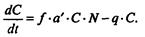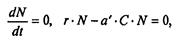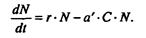 (q - смертность). Скорость рождения новых особей в данной модели полагается зависящей от двух обстоятельств: скорости потребления пищи a'∙C∙N, и эффективности f, с которой эта пища переходит в потомство хищника. Итак, для численности хищника окончательно получаем