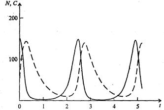 Рис. 7.47. Динамика численности популяции хищника и жертвы при r = 5, а' = 0,1, q = 2, f = 0,6, N0 = 150, C0 = 50. Сплошная линия - численность жертвы, штриховая – хищника