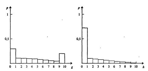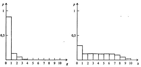 В рассмотренной задаче, как и в любой болеесложной задачеоб очередях,может возникнуть критическая ситуация, когда очередь неограниченно растет со временем. В самом деле, если люди заходят в магазин очень часто (или продавец работает слишком медленно), очередь начинает нарастать, и в любой системе с конечным временем обслуживания наступит кризис. Приведем для иллюстрации динамики этого процесса распределения величина - времени ожидания покупателем в очереди и h - времени простоя продавца в ожидании покупателя, при трех наборах параметров w1, w2, где w1 - максимальный интервал времени между приходами покупателей, w2 - максимальная длительность обслуживания покупателя (рис. 7.57 - 7.59).
