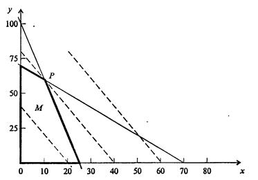 Этой линии соответствует значение f = 80. Пунктирная линия правее хоть и соответствует большему значению f, но не имеет общих точек с М, левее - меньшим значениям f. Координаты точки Р (10, 60) - искомый оптимальный план производства.