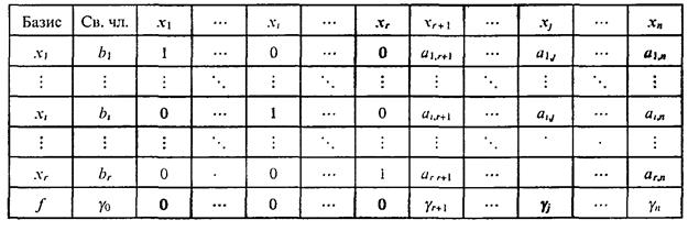и требуется отыскать минимум линейной функции (7.81). Для отыскания произвольного опорного решения приведем (7.85) к виду, в котором некоторые r неизвестных выражены через остальные, а свободные члены неотрицательны (как это сделать - обсудим позднее):
