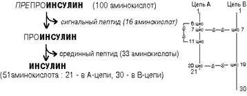 Оказалось, что этот белок синтезируется в виде единственной полипептидной цепи (ПРЕПРОИНСУЛИН), в которой содержится 100 аминокислотных остатков. После гидролиза со стороны N-конца от молекулы отрывается сигнальный пептид (16 аминокислот) и образуется ПРОИНСУЛИН. Наличие сигнальной последовательности в препроинсулине позволяет ему проникать через мембраны трубочек эндоплазматического ретикулума. А превращение препроинсулина в проинсулин происходит внутри трубочек под действием высокоспецифичной протеиназы.