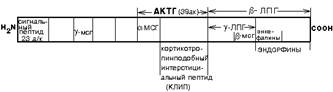 Сам АКТГ состоит из аминокислот от 131-й до 170-й в составе этого белка, а остальные участки содержат сигнальную последовательность и в составе этой же молекулы содержится полипептид, из которого образуется меланоцитстимулирующий гормон (МСГ). В ходе процессинга от проопиокортина вначале отщепляется сигнальная последовательность и затем после двух реакций протеолиза со стороны N-конца и С-конца отделяется пептид гамма2-МСГ (меланоцитстимулирующий гормон). АКТГ освобождается с N-конца.