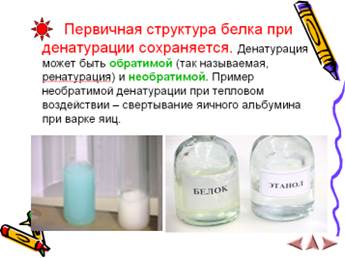 Учитель. Для белков характерны реакции, в результате которых выпадает осадок. Но в одних случаях полученный осадок при избытке воды растворяется, а в других – происходит необратимое свертывание белков, т.е. денатурация. Ренатурация – это процесс обратный денатурации.