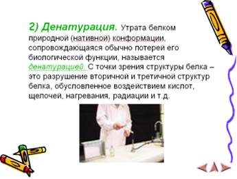 Вывод: Денатурация белков – сложный процесс, при котором под влиянием внешних факторов: температура, действия химических реагентов, механического воздействия и ряда других, происходит изменение вторичной, третичной и четвертичной структур белковой макромолекулы. Первичная структура, а, следовательно, и химический состав белка не меняется. При денатурации изменяются физические свойства белка, снижается растворимость, теряется биологическая активность, меняется форма белковой макромолекулы, происходит агрегирование.
