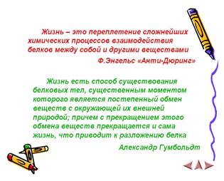 Белки – основа живого на Земле, входят в состав кожи, мышечной и нервной ткани, волос, сухожилий, стенок сосудов животных и человека; это строительный материал клетки. Роль белков трудно переоценить, т.о. жизнь на нашей планете действительно можно рассматривать как способ существования белковых тел, осуществляющих обменом веществ и энергией с внешней средой.